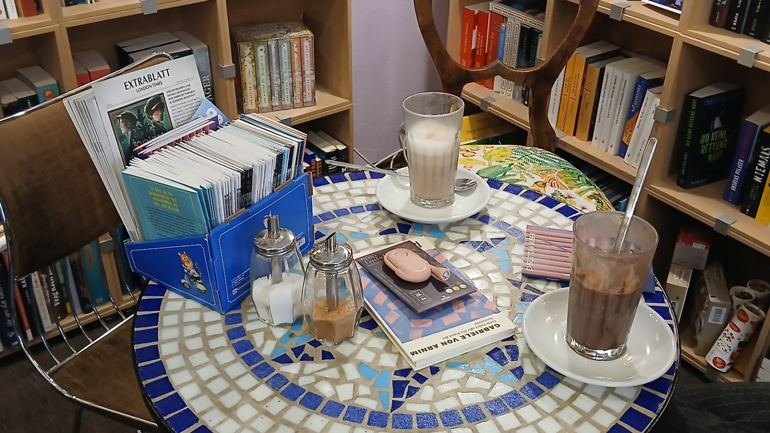 „Mit Hafermilch?“ Anscheinend gibt es hier ein gewisses Muster der Kundinnen. Natürlich mit Hafermilch, wie konnte ich es nur vergessen? Die beiden Wunschbücher sind gerade nicht da, könnten bis morgen bestellt werden, aber nein, morgen sind wir bereits auf dem Weg nach Hause. Ich werde zum Regal geführt, wo die Bücher stehen würden, die Getränke kommen gleich.